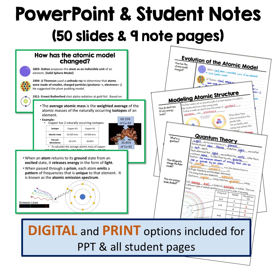 Looking for a high school chemistry unit that covers everything about the atom? This 18-day lesson bundle covers atomic structure, isotopes, nuclear decay, electron configurations, and valence electrons with engaging activities and user-friendly guided notes! All student pages come in both PRINT and DIGITAL versions for efficient use in class or through distance learning.