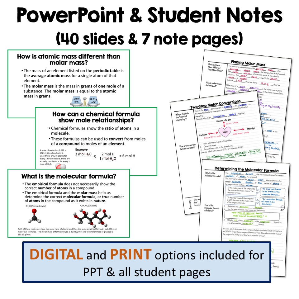 Looking for a thorough and ready-to-use high school chemistry unit to teach your students about the mole and molar calculations? This 13-day lesson bundle covers Avogadro’s number, molar conversion, and composition of compounds with engaging activities and user-friendly guided notes! All student pages come in both PRINT and DIGITAL versions for efficient use in class or through distance learning.