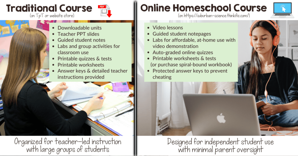 The full-year courses found on TpT or my website store are written for classroom teachers. The online homeschool courses are written specifically for homeschooling students, with a student-friendly format that allows students to work independently. Both courses cover a year of high school lab science. Both include labs, notes, and assessments. Here’s a simple comparison to help you decide which best fits your situation.